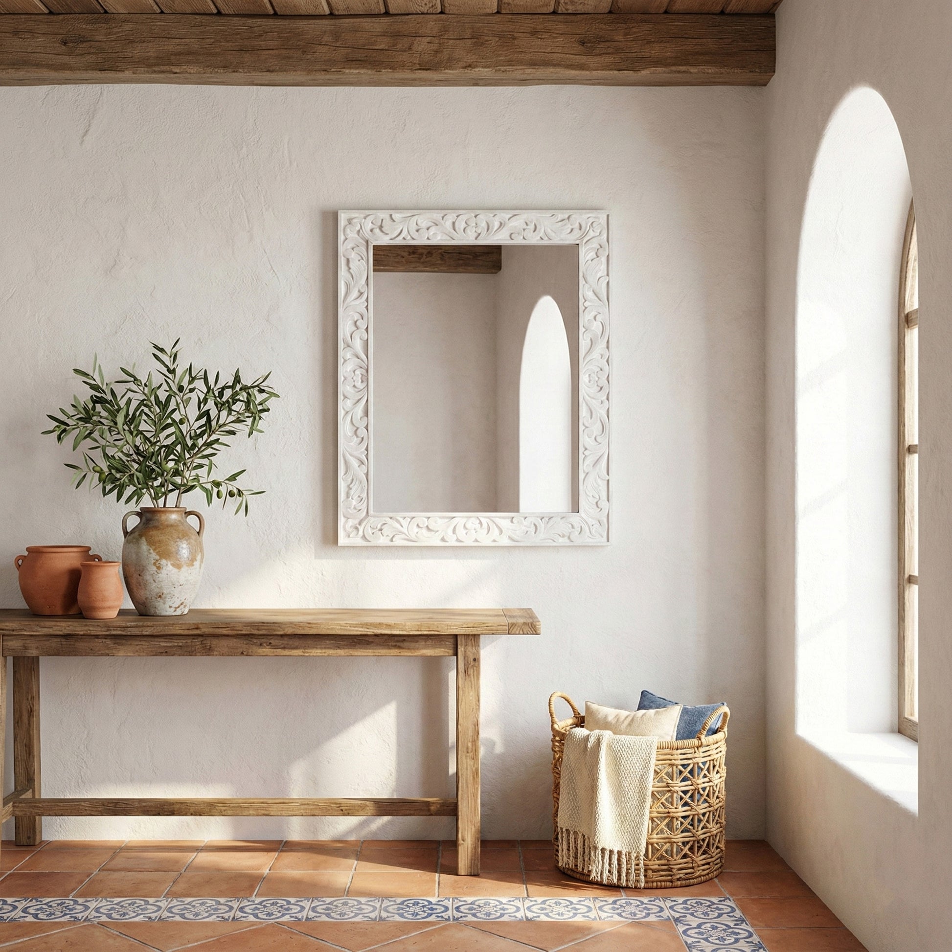 Hand Carved Mirror "Asmara" in White - 90 cm