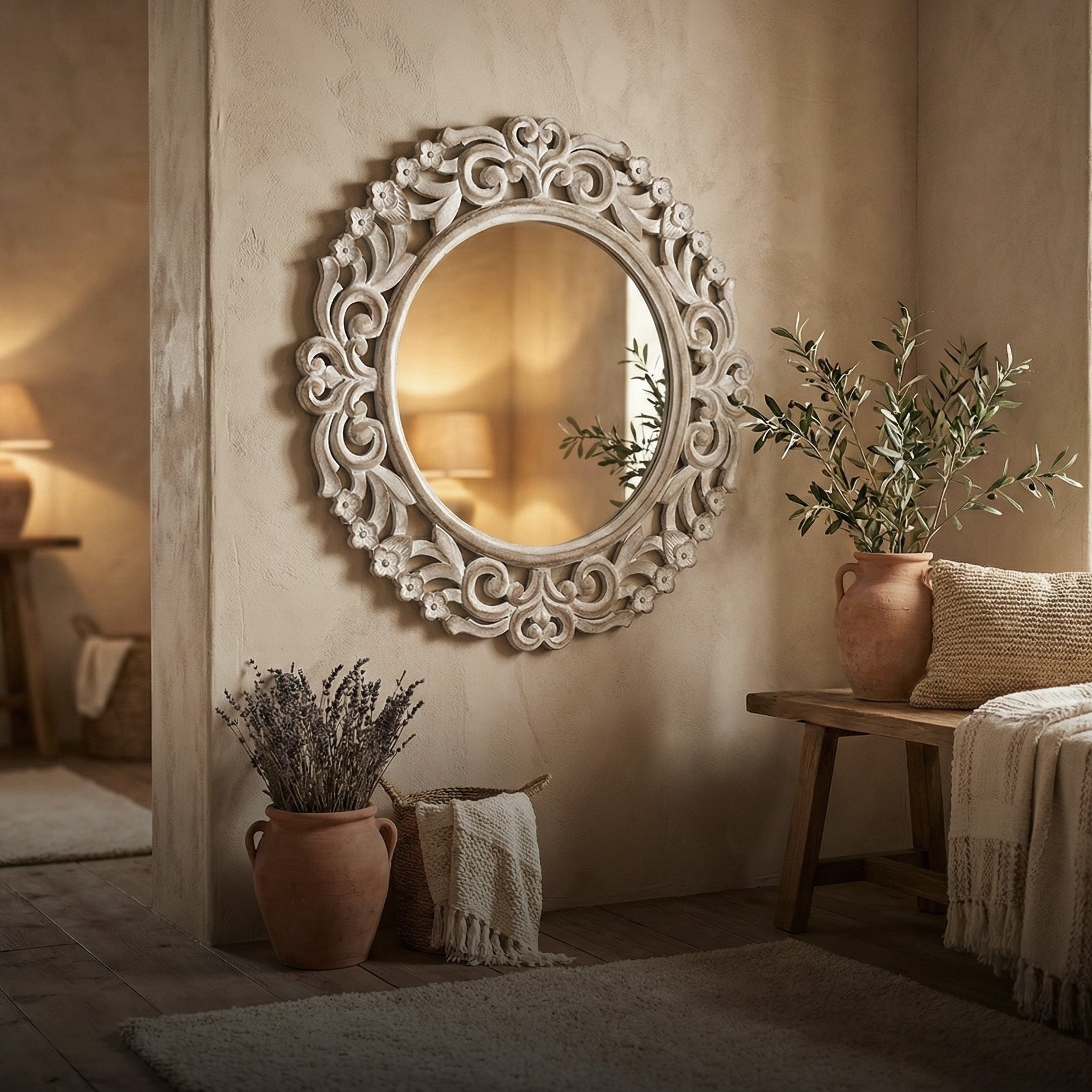 Hand Carved Mirror "Hujan" - Antic-wash - 70 cm