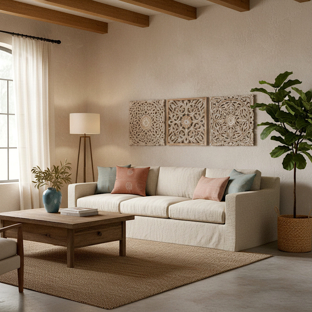 Crafted by skilled Balinese artisans, the Set of 3 Decorative Panels "Pererenan" is a masterpiece of tradition and craftsmanship. Each piece is 100% handmade, intricately carved using simple tools—no machines—ensuring unmatched detail and uniqueness. Rooted in spirituality and beauty, this headboard brings the essence of Bali into your home.