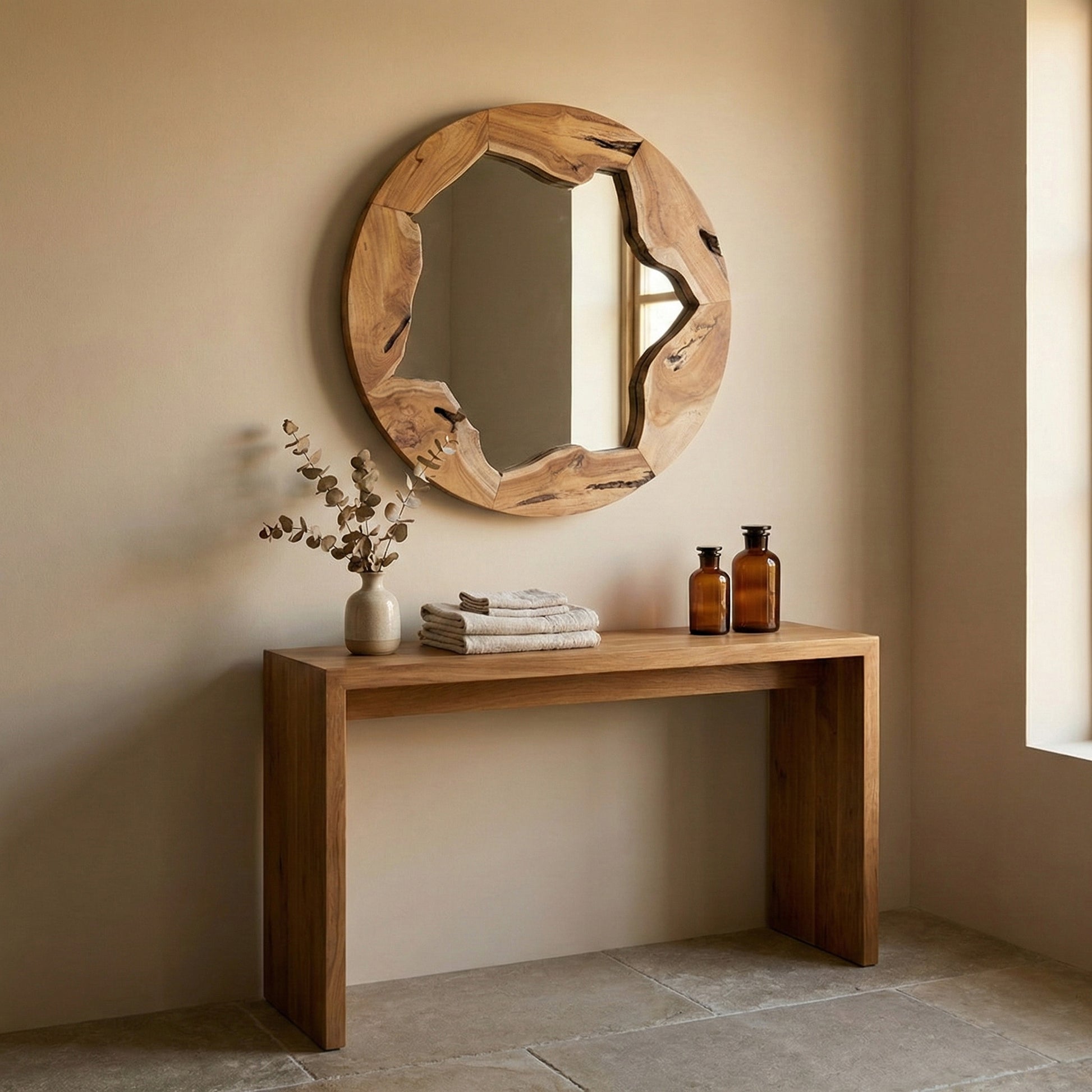 Crafted from natural wood with soft, organic edges, Teduh celebrates the beauty of imperfection and the soothing rhythms of nature. Its modest 50 cm size makes it ideal for cozy corners — by the entryway, above a console, in the bathroom, or as a thoughtful accent in your bedroom or living room.