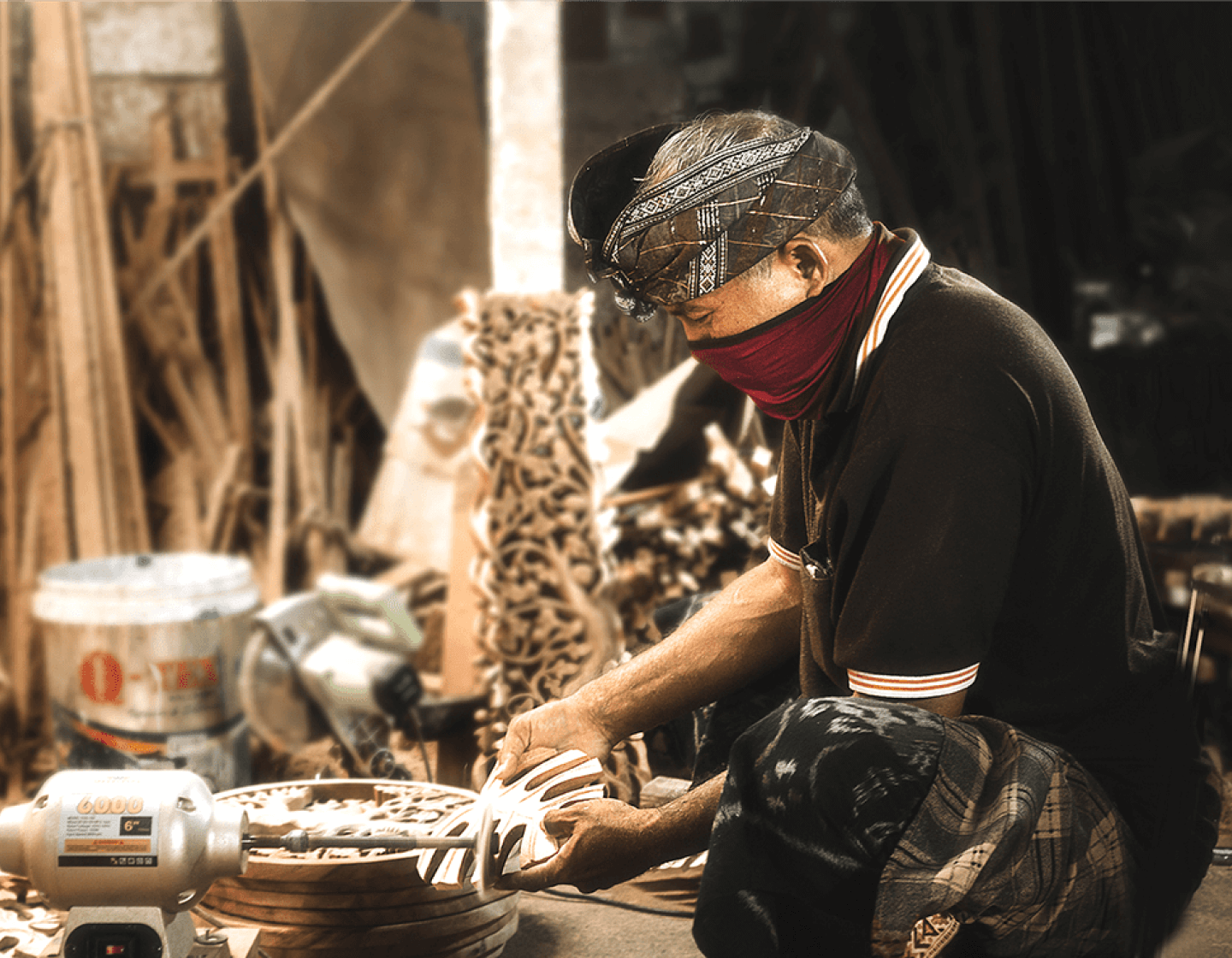 Every piece in our collection is handcrafted in Bali by skilled artisans who have often learned their trade from generations before them. We partner with family-owned workshops in Ubud, Mas, and surrounding regions — places where the sound of carving tools still echoes through the villages, and the spirit of creation is alive in every grain of