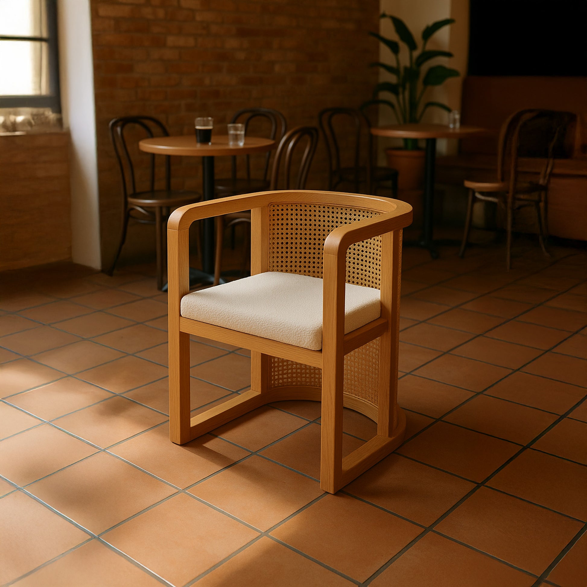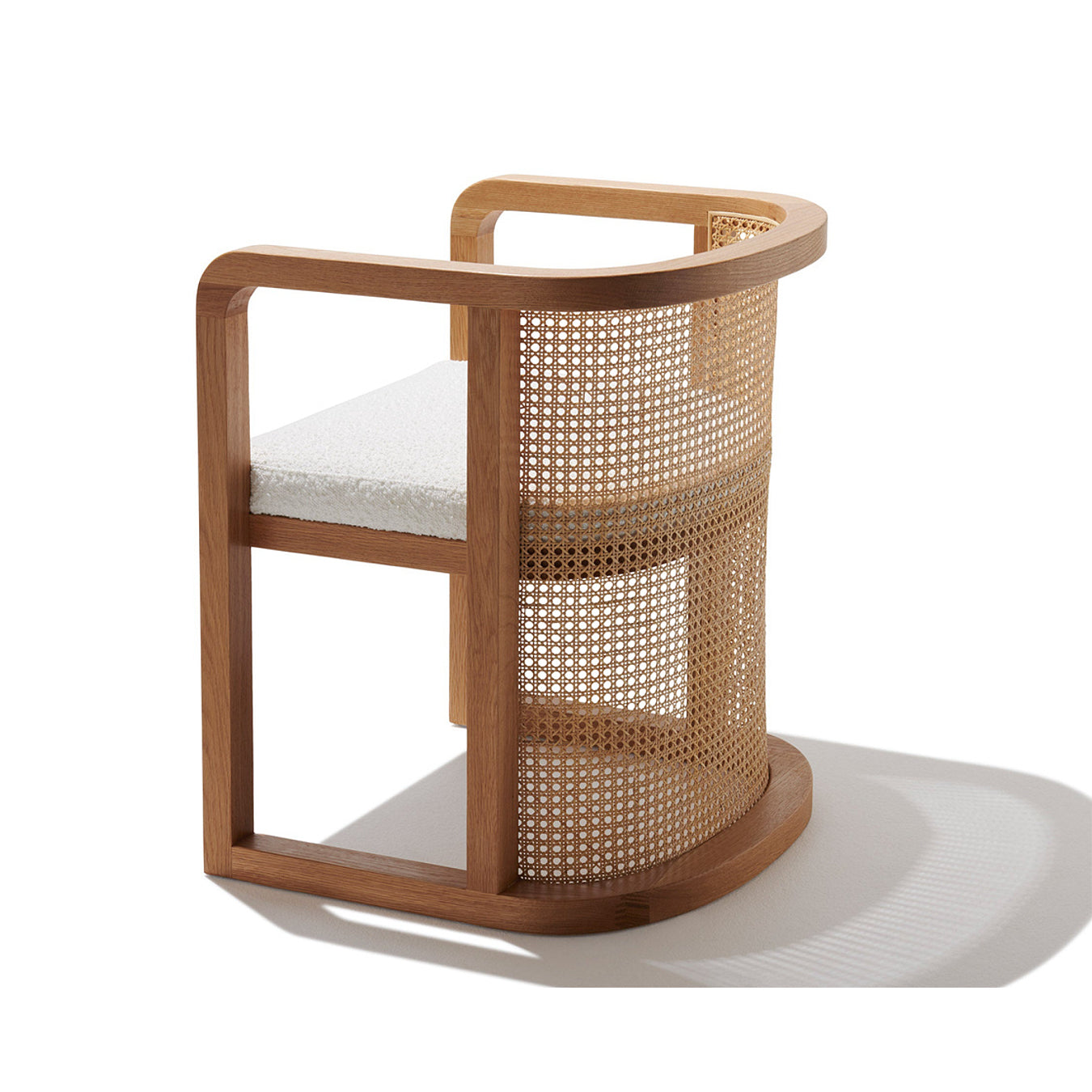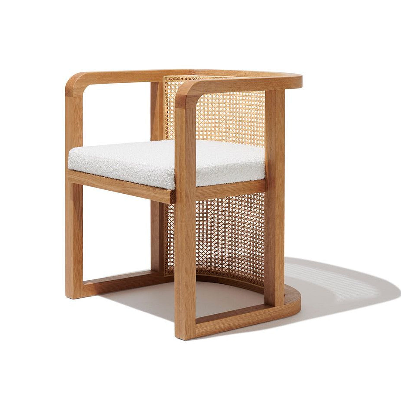 Exquisite design encourages everyday comfort. The Cambria Chair features an alluring U-shaped frame accented by woven cane and negative space, offset by a textured cushion.
