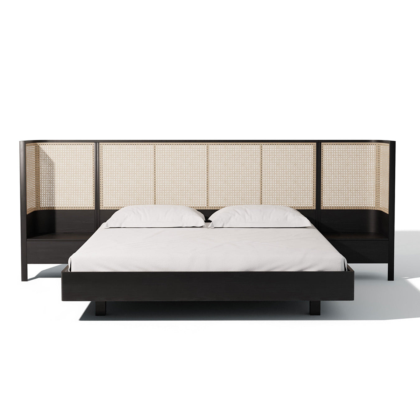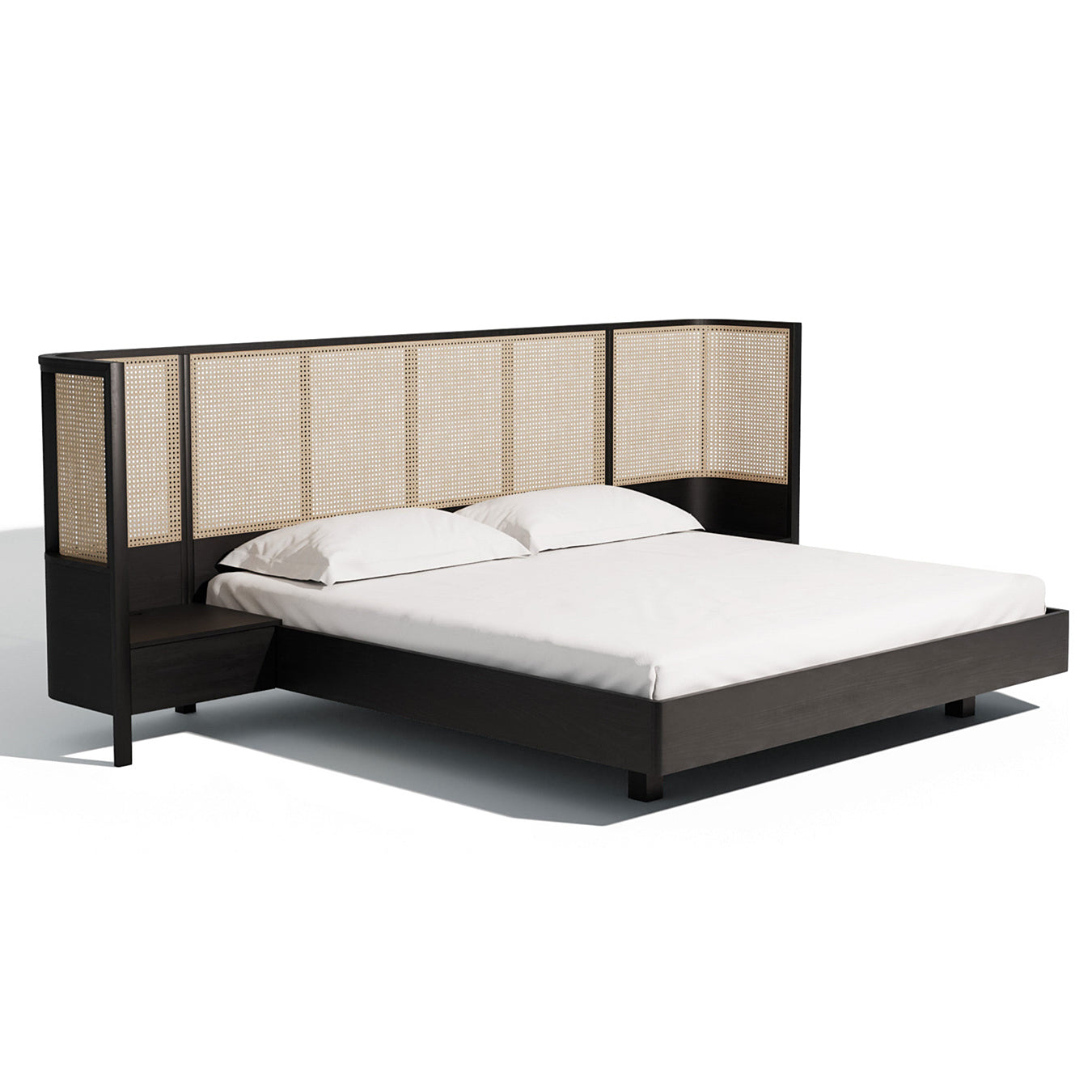 Give your bedroom a sophisticated centrepiece—the Cane Storage Bed provides both art and utility in any open bedroom space, offering an oversized headboard with built-in side tables. The wrap-around design of the bed's frame creates a cozy nook for restful sleep.