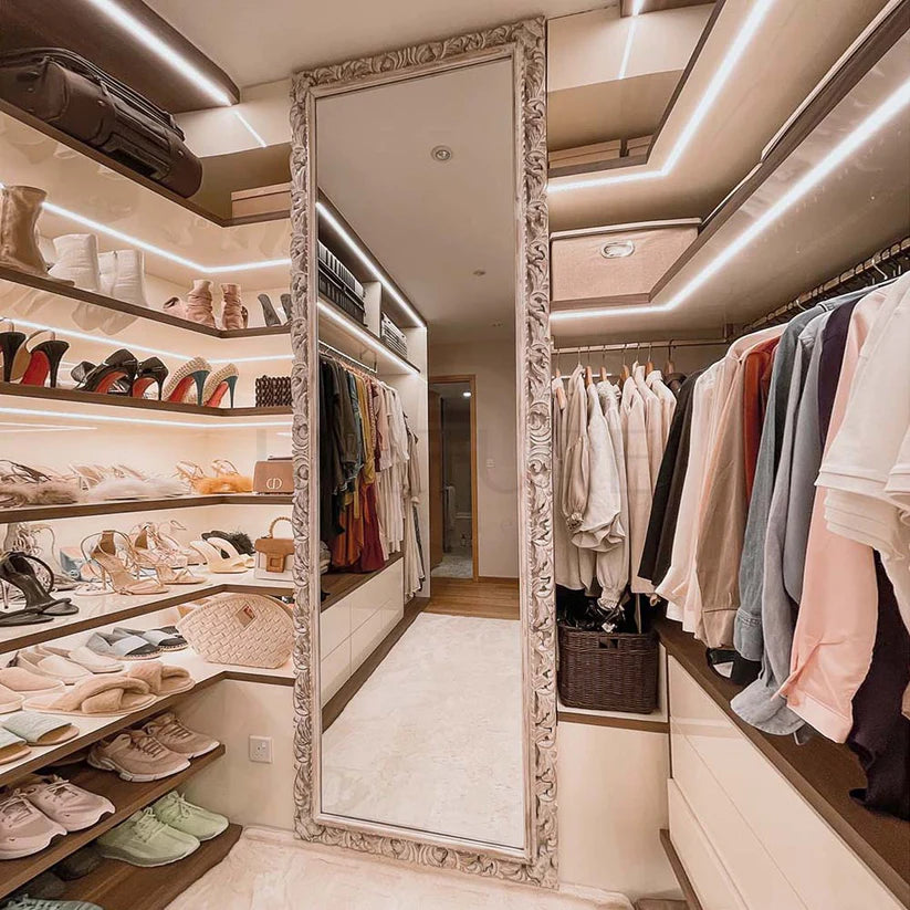 This beautiful mirror boasts a thin frame with fine carvings and a large glass surface. Standing lean and tall, it will deliver an amazing result when used as a backdrop for your selfies when trying new outfits!