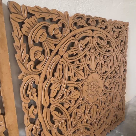Hand carved by a local craftsman in Ubud, Bali, this intricate decorative wood panel depicts a big local flowers from the Island of Gods.